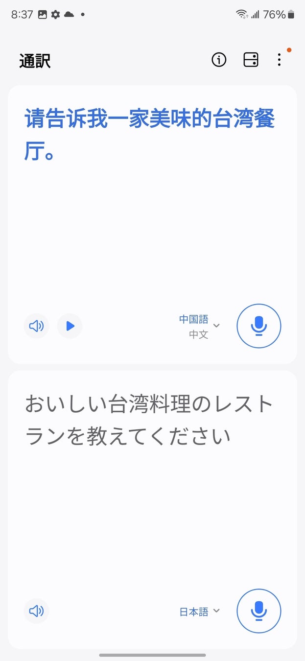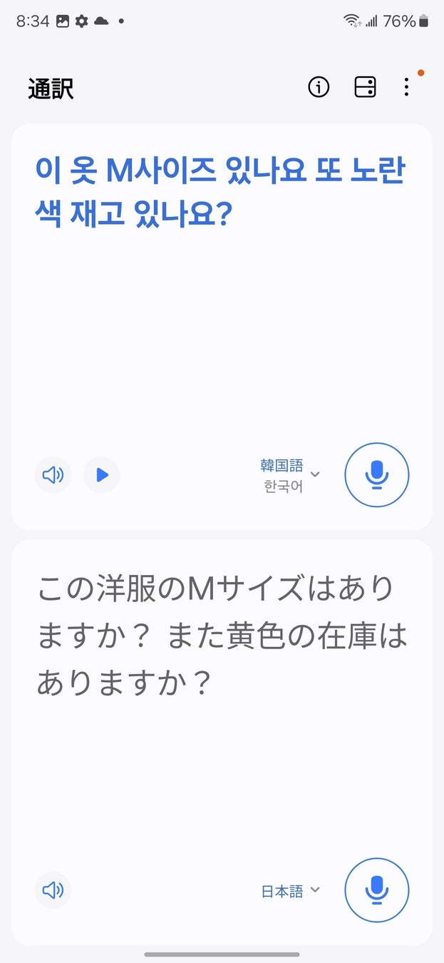 道に迷ったとき、タクシーで料金を確認したいとき、お店で欲しい物の好きな色がなかった時、飲食店でテイクアウトを伝えたいとき、フライトが急に変更になり外国人のキャビンアテンダントと会話をしたいなど、困ったときや質問・会話をしたいときに便利にご利用いただくことができます。本機能は日本語を含む13カ国語※の言語に翻訳することが可能で、本機能はGalaxyのオンデバイスAIを搭載しているため、フライトモードでもご利用いただけます。