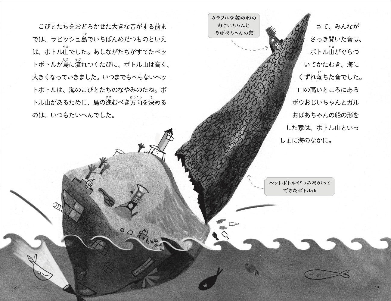 ある日、ラビッシュ島で聞いたことのない音がしました。それは、海のこびとたちのなやみの種、ボトル山がくずれおちる音でした。