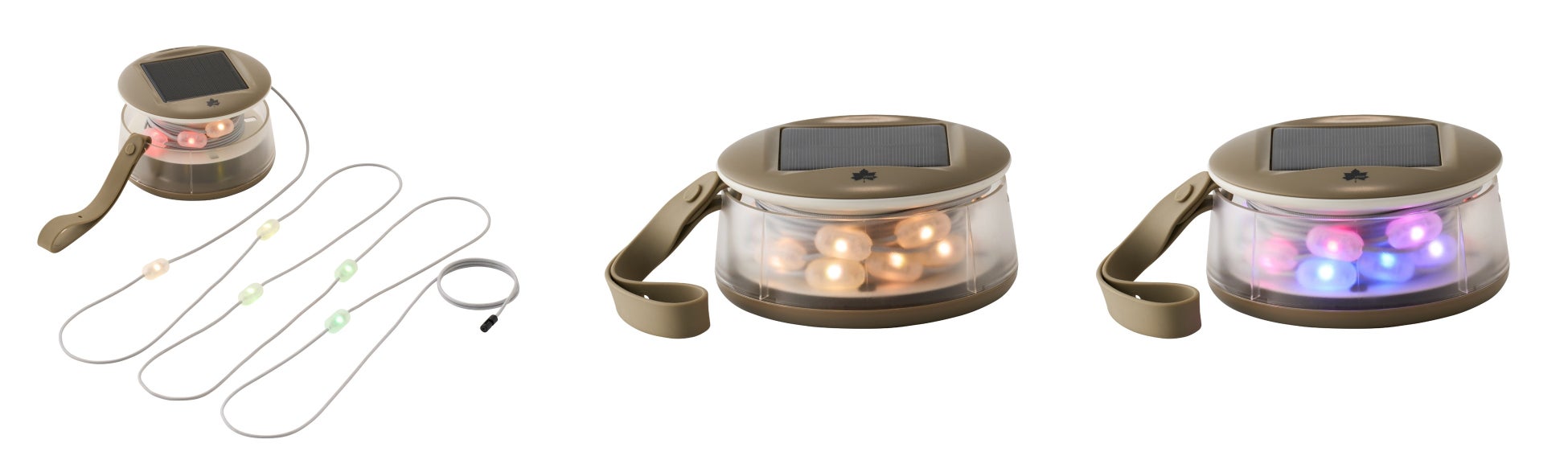 4種類の点灯モード搭載でテントサイトを彩ることができるほか、ランタンとしても使用可能な「キラメキまきまきソーラーライト」を、アウトドアライフでぜひご活用ください。