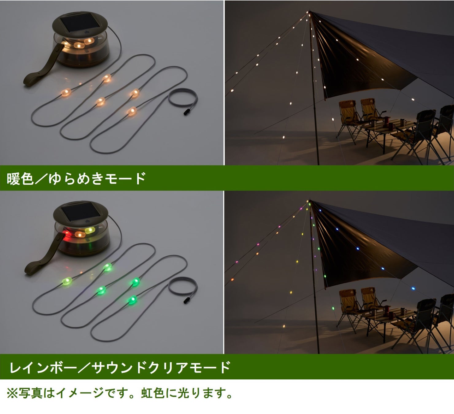 光り方や光る色が異なる4つの点灯モードを搭載しており、シーンに応じて使い分けて楽しむことがきます。しっかりと周囲を照らしたいときは「暖色モード」、リラックスしたいときは雰囲気も満点の「ゆらめきモード」がおすすめです。また、サイトを楽しくにぎやかに彩りたいときには虹色にゆらめく「レインボーモード」や、音に反応して虹色に点滅する「サウンドクリアモード」が最適です。540cmと長めのコードに10個のLEDが付いており、広めのキャンプサイトの装飾もラクラクです。