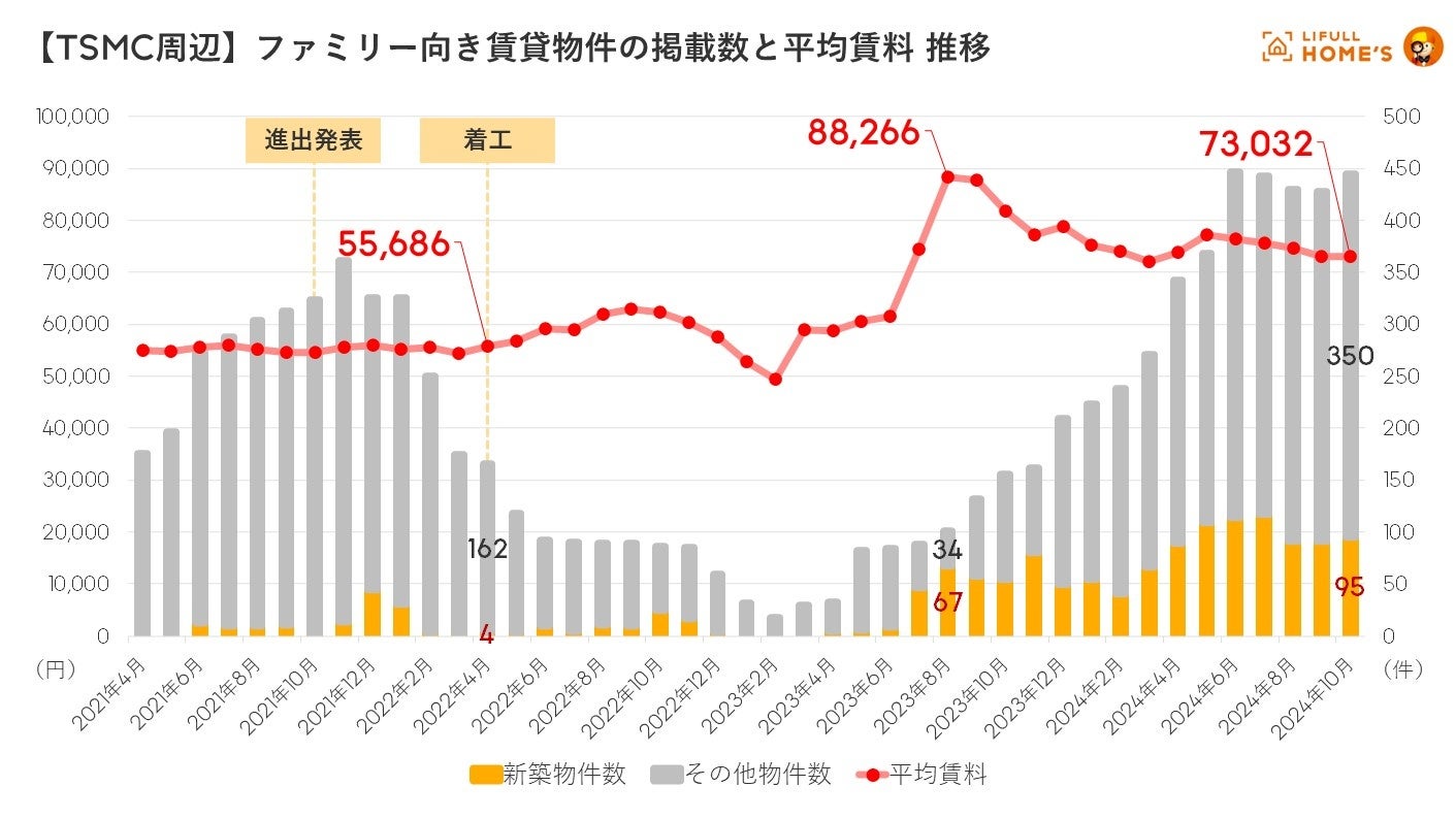 TSMC周辺のファミリー物件平均賃料は、工場が着工した2022年4月には5万5,686円でした。その後空室が減少するなかでも平均賃料が大きく上昇することはなかったものの、新築物件の供給が増え始めた2023年夏頃に大きく上昇し、同年8月には8万8,266円で着工月比+58.5%となりました。一般的に計画から建設までに一定の期間を要する賃貸物件ですが、TSMC進出発表後に計画された物件が完成し、募集が開始されたことで供給が急増。今年10月時点の新築物件数は、着工月の約23倍にまで上りました。比較的賃料水準の高い新築物件が、掲載物件に占める割合が高まったことで、平均賃料が上昇したものと推察されます。その後、既築物件の空室が増加したほか、掲載物件に占める新築の割合も安定して推移しており、今年10月時点の平均賃料は7万3,032円(着工月比+31.2%)となっています。