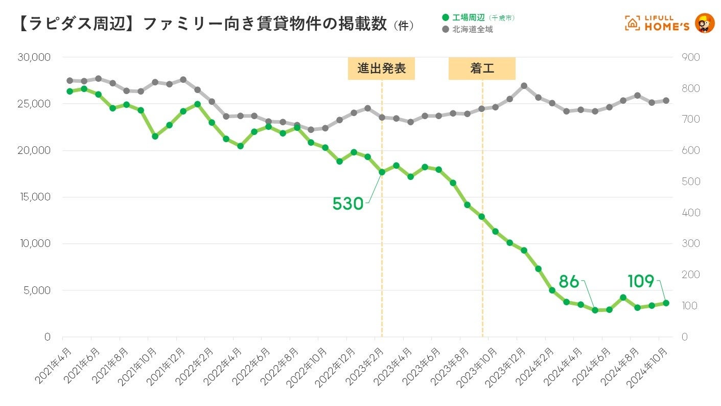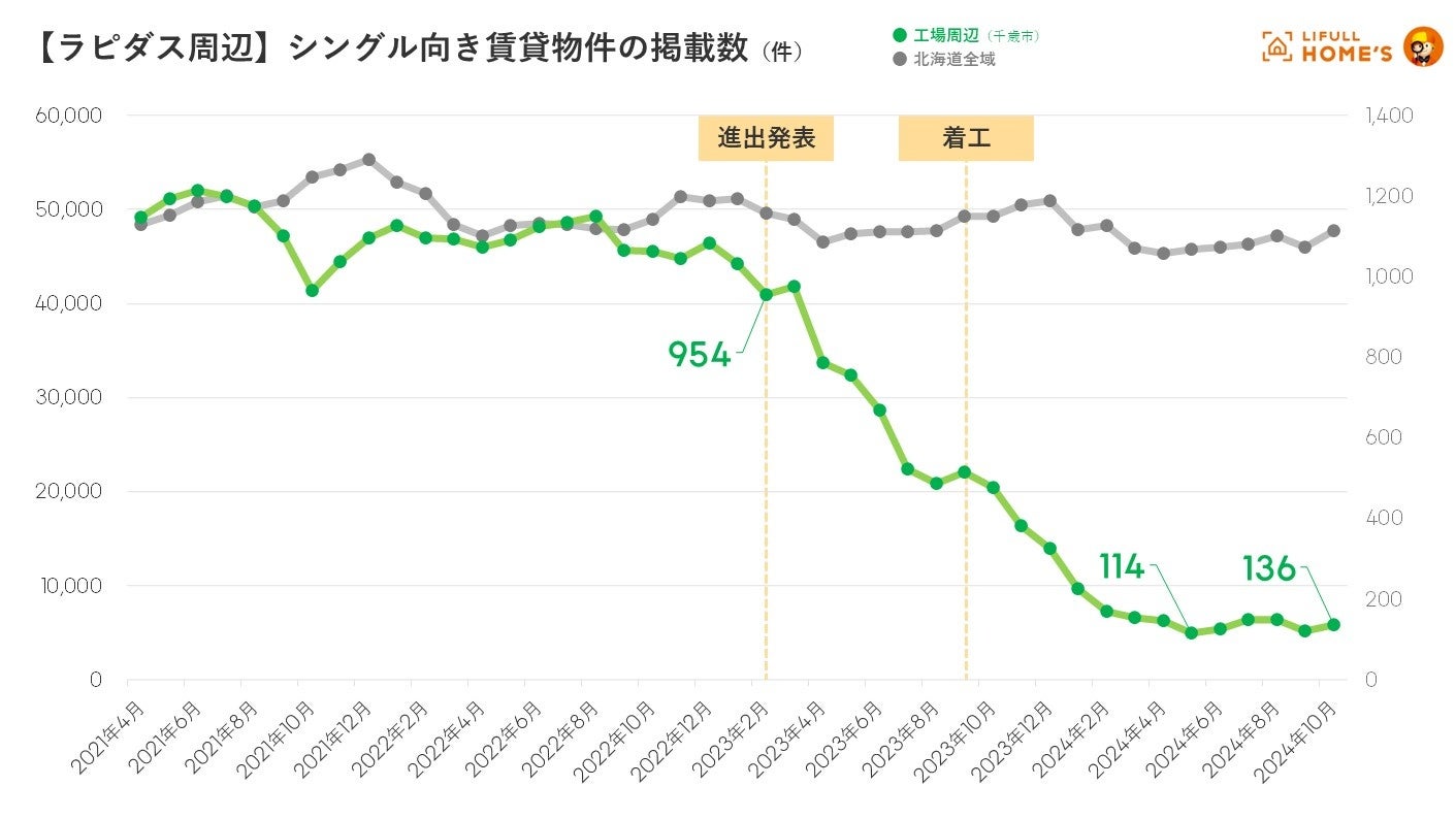 ラピダスが2023年2月に北海道千歳市への進出を発表して以降、千歳市のシングル向き賃貸物件では直後から、ファミリー向き賃貸物件では同年7月頃から、LIFULL HOME'Sにおける工場周辺の掲載物件数の下落が顕著になりました。工場着工後も下落傾向は続き、着工8ヶ月後の今年5月にはシングル物件で114物件(進出発表月比▲88.1%)、ファミリー向き物件で86物件(進出発表月比▲83.8%)となるなど低水準で推移し、今年10月現在でも需給は逼迫傾向にあります。