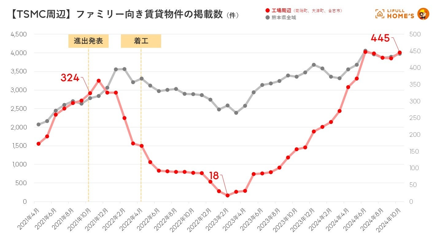 TSMCが2021年10月に熊本県菊陽町への進出を発表して以降、同年12月頃から、LIFULL HOME'Sにおける工場周辺(菊陽町、大津町、合志市)の掲載物件数はシングル向き賃貸物件、ファミリー向き賃貸物件ともに急激に下落。2022年4月の工場着工後は横ばい傾向となるものの、着工10ヶ月後の2023年2月にはシングル物件の掲載数が11物件(進出発表月比▲94.3%)、ファミリー物件の掲載数が18物件(進出発表月比▲94.4%)となるなど低水準で推移しました。その後、2023年8月(進出発表後22ヶ月、着工後16ヶ月)頃から掲載物件数は大きく増加に転じ、今年春頃には進出発表前の水準を超えるまでに回復し、現在に至っています。