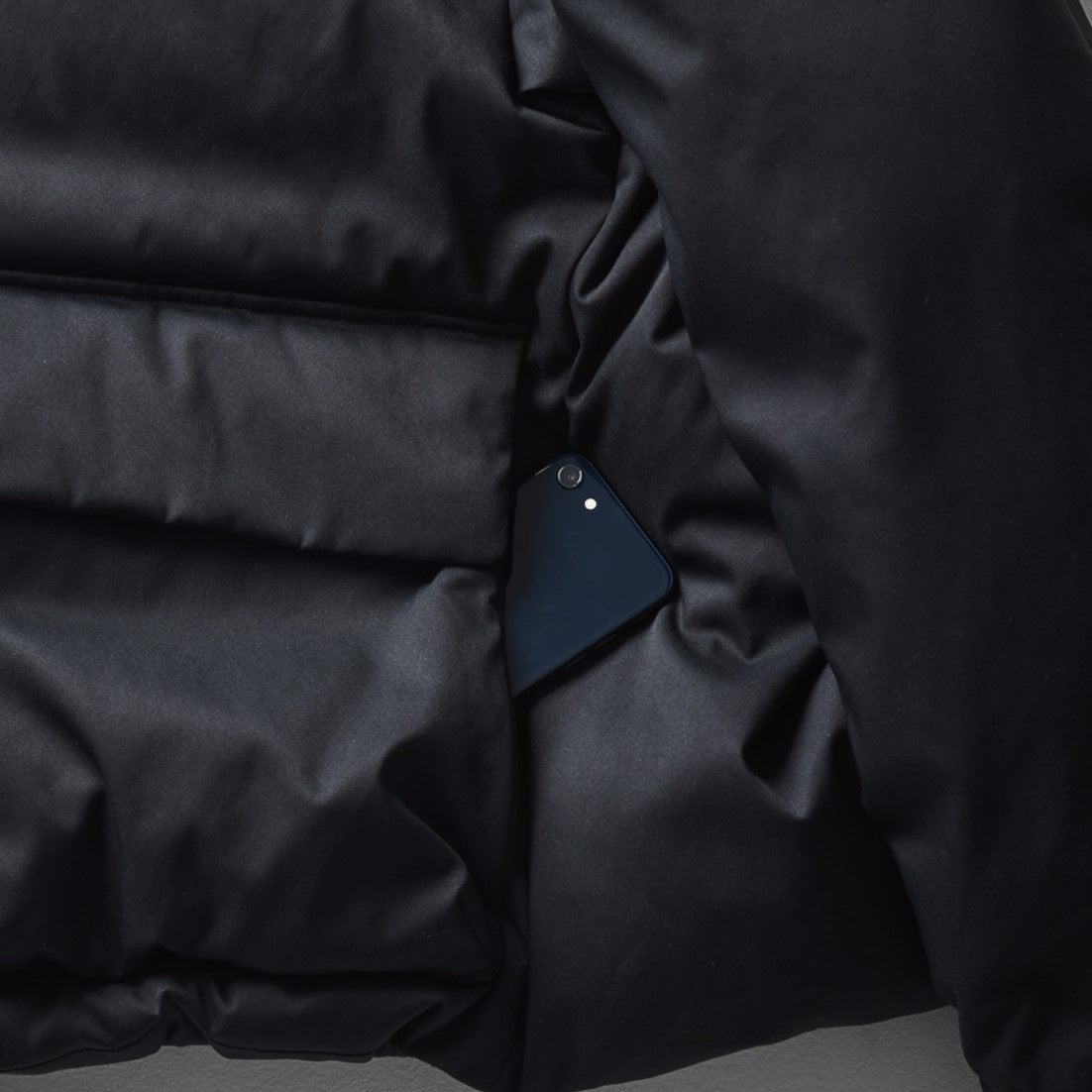 レインウェアの2倍以上の撥水で小雨や汚れを弾き、内部からの湿度を外に逃がすことで、蒸れを軽減し、快適な着心地を実現します。800FP*¹もの高いフィルパワーのダウンを、160gとふんだんに封入*²。表地・ダウンパック・ダウン・裏地の4層構造に仕立てることで、見た目のスマートさを損なわず、羽毛の飛び出しやダウンの偏りを防ぎます。