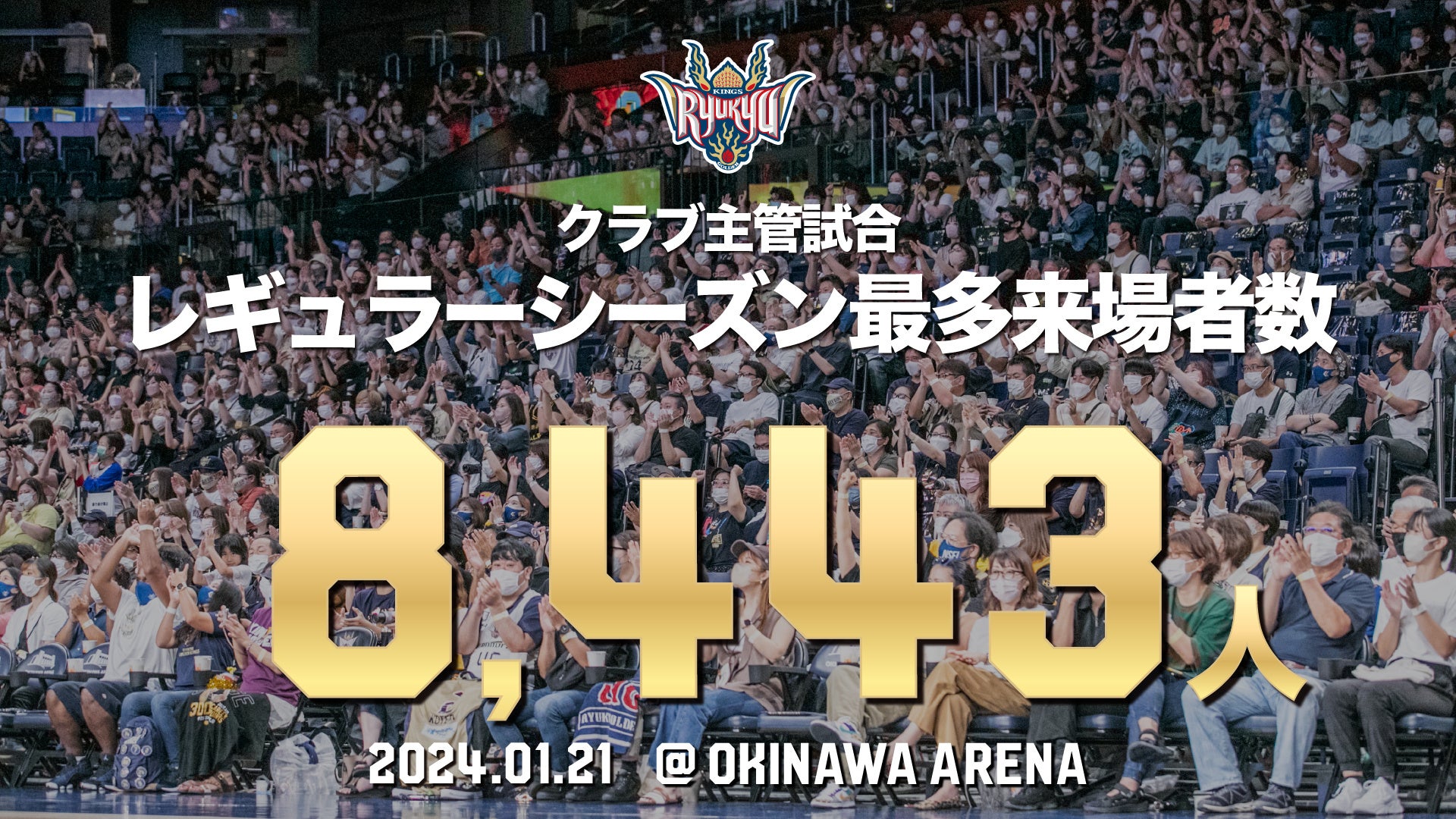 本日1月21日(日)、沖縄アリーナで行われた宇都宮ブレックス戦にて8,443人のお客様にご来場いただきました。2023年12月31日に沖縄アリーナにて行われた仙台89ERS戦の8,412人の最多来場者数を更新し、クラブ主幹試合レギュラーシーズン最多来場者数記録となります。