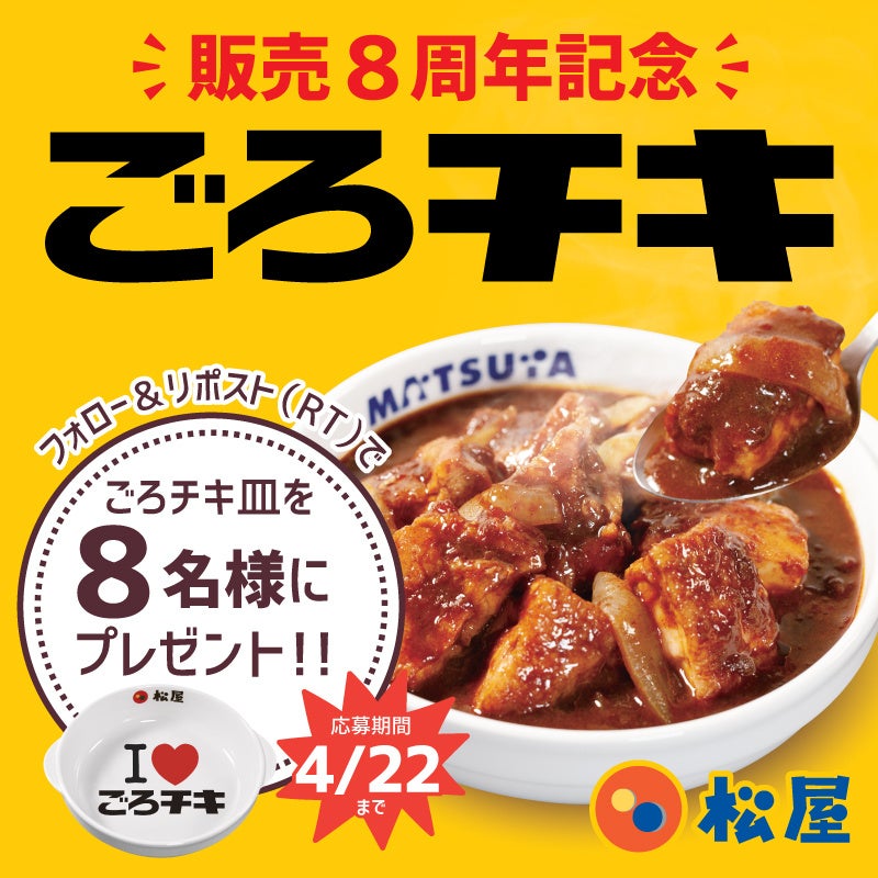 『ごろチキ』販売開始8周年を記念して、松屋公式Xのフォロー&リポストキャンペーンにて、『ごろチキ皿』を限定8名様にプレゼントいたします。