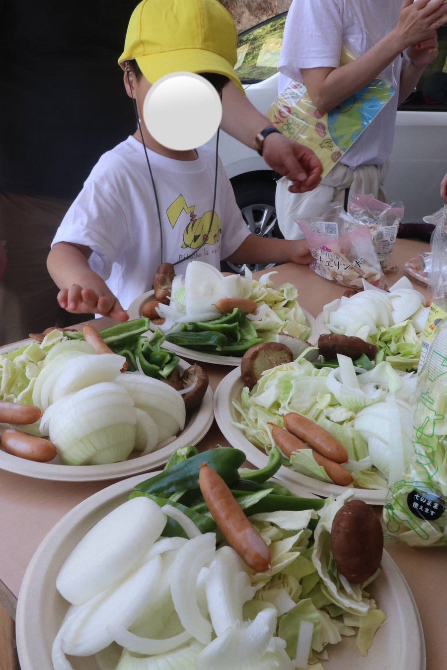 玉ねぎ収穫体験では、玉ねぎ畑まで歩いて行き、農園のスタッフの方より収穫の仕方を聞きました。収穫したい玉ねぎを選び、葉の部分を持って引き抜くという作業は、親子で取り組みやすく、収穫体験を楽しむことができました。収穫した玉ねぎの葉と根をハサミで切り、各自で購入して持ち帰りました。つづいてバーベキューでは、自ら率先して手伝いを申し出る子もおり、紙皿や紙コップ、飲み物を配り、野菜を切って、各テーブルに運ぶ等しました。大人も子どもも一緒に協力して、食事する喜びを経験することができたと思います。