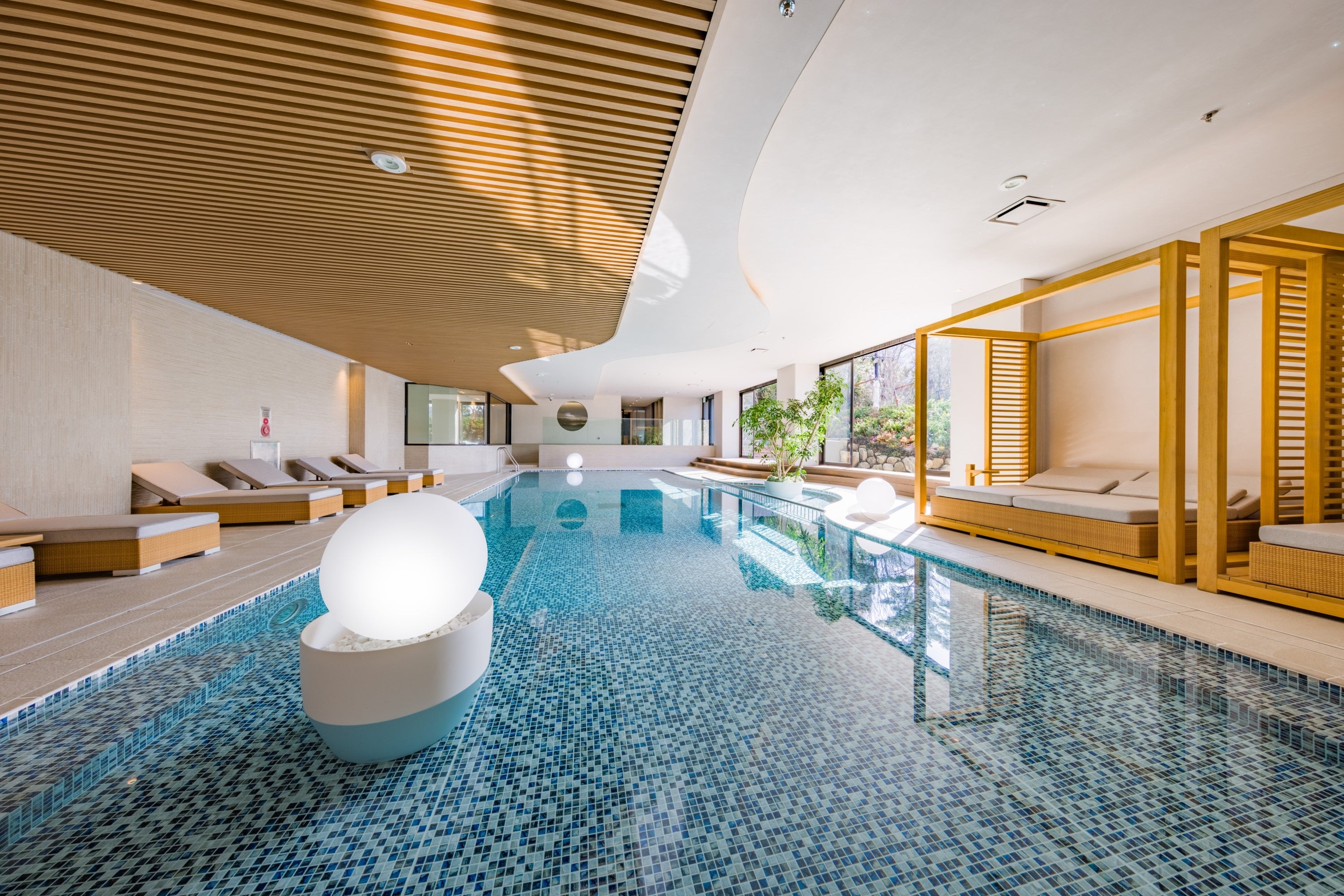 敷地内の自家源泉を使用したサーマルプールでは、青いモザイクタイルが水面に反射し、夜は星空をイメージした照明でくつろぎのシーンを演出します。室内のため、全天候に対応しています。