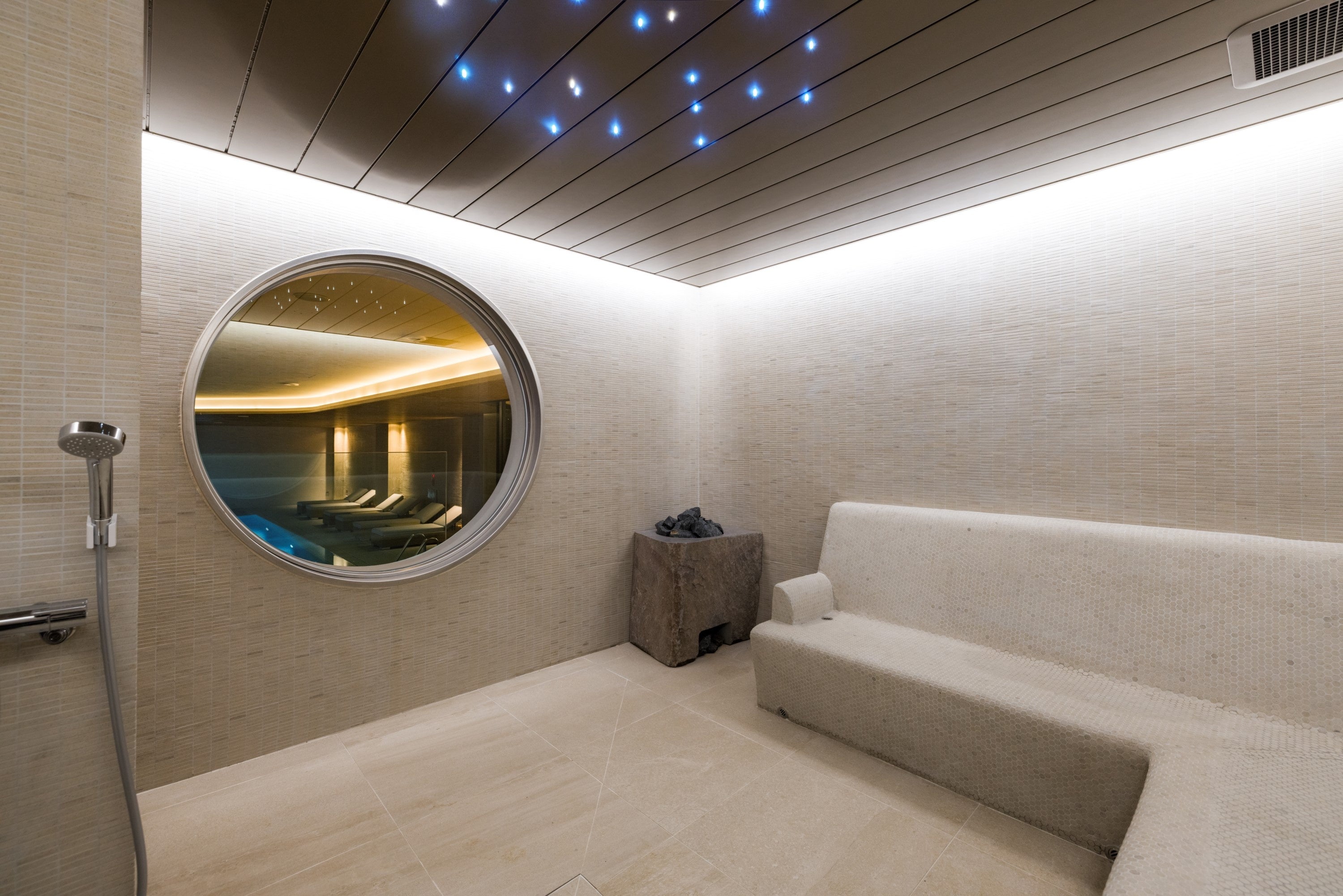 室内を体温とほぼ同温に設定したミストで充満させたサーマルルーム。リラックスできるよう天井に配された星空をイメージした灯りの中、ゆっくりと身体を温めることができます。