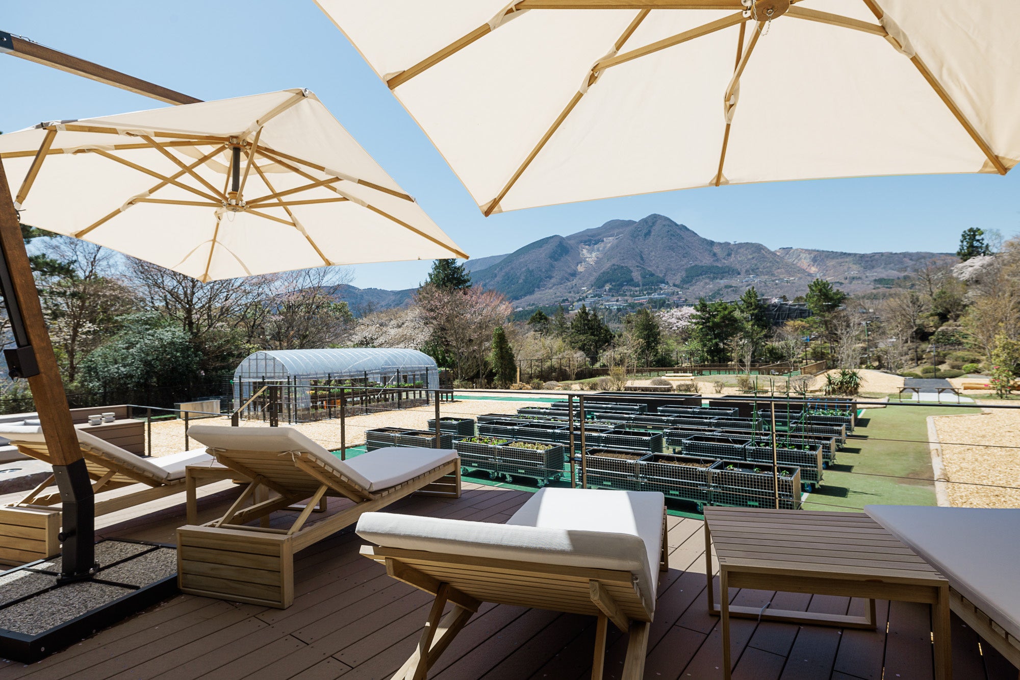 サーマルプール、サーマルルームから繋がる「ととのいテラス」。箱根の間伐材のヒノキを使用したウッドテラスでは、早雲山をはじめ箱根の雄大な景色を眺めながらの外気浴で“ととのう”を体感できます。
