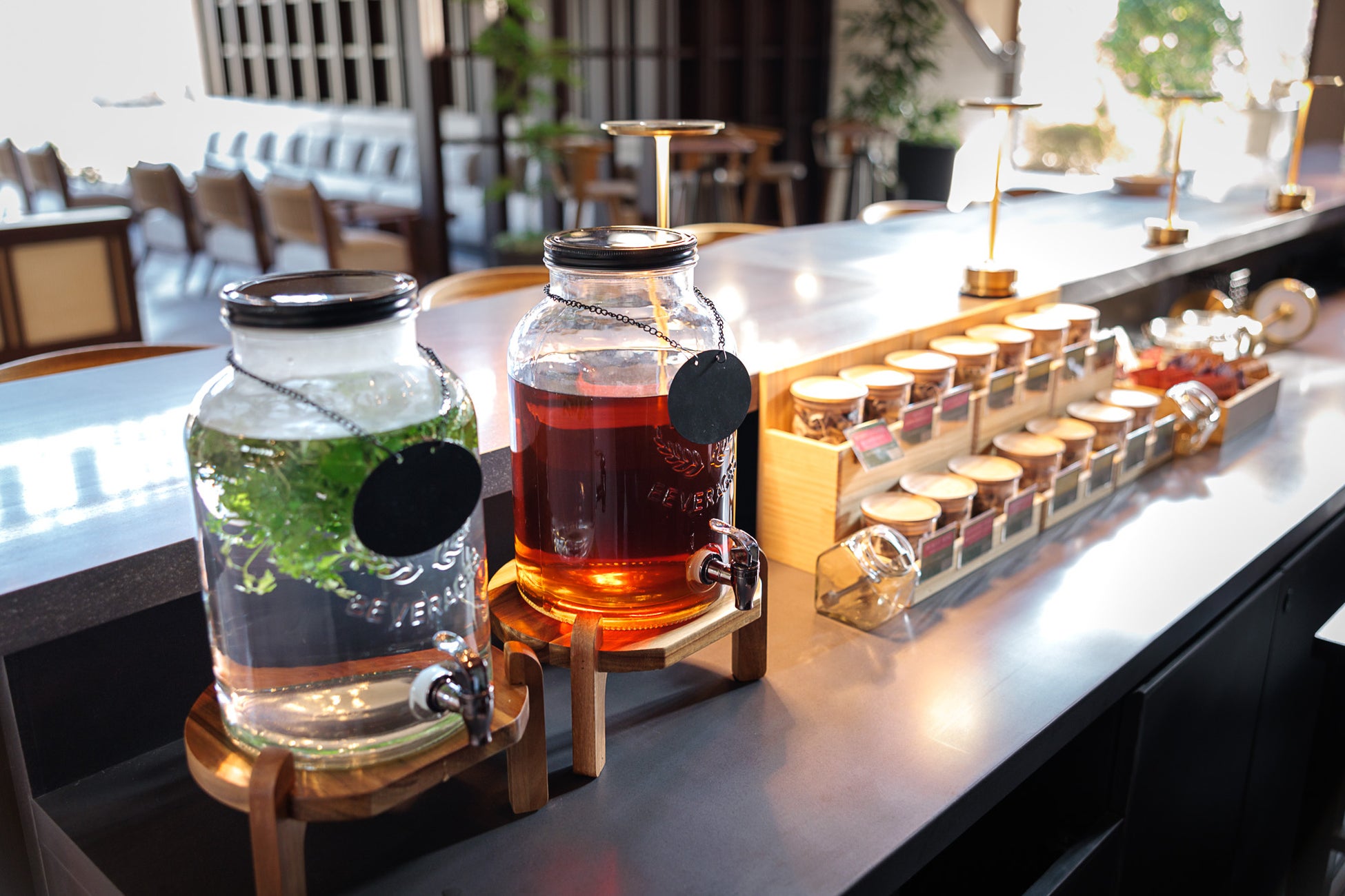 ロビーラウンジではフリーフローが楽しめ、ウェルカムドリンクとして、また滞在中のお飲み物として、自家製のデトックスウォーターをはじめ、コーヒー、紅茶、緑茶、ハーブティーなど全 10 種類以上のドリンクをご用意。ハーブや数種類のフレーバーシロップもあり、お好みのオリジナルティーを作ることもできます。ご宿泊者にお渡しする「オリジナルタンブラー」に入れて、サーマルプールなどの温浴施設へ持ち込むことも可能。お好きなドリンクで自由に水分補給することで、より充実した心と身体を“ととのえる”時間をお過ごしいただけます。