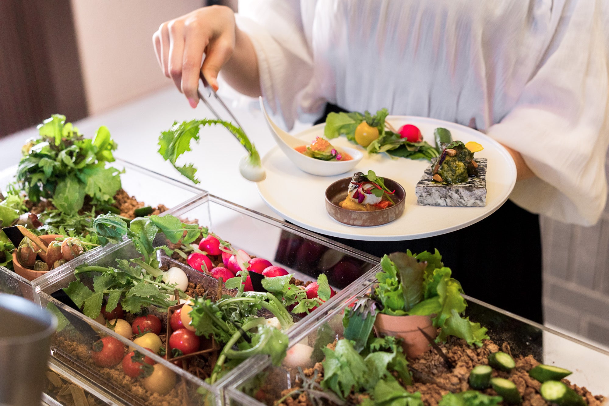 “心と身体をととのえる”をコンセプトにしたレストラン「crescita(クレシータ)」では、西麻布「No Code」オーナーシェフ・米澤文雄氏が監修のご夕食コース「Rapporti(ラッポルティ)」をご提供いたします。前菜、スペシャリテ、パスタ、メイン、デザートの5品で構成され、はじめの一皿となる前菜は、農園をイメージし様々な野菜が並ぶ「サラダブッフェ」です。お客様ご自身で “収穫する” ことから始まる「crescita(クレシータ)」ならではの食体験を、ぜひお楽しみください。