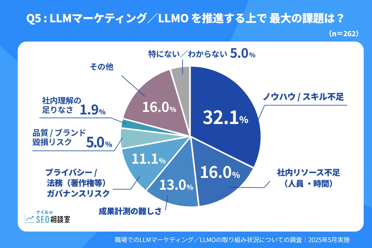 LLMマーケティングやLLMOを進める上での最大の課題としては、「ノウハウ/スキル不足」(32.1%)が最も多く挙げられました。