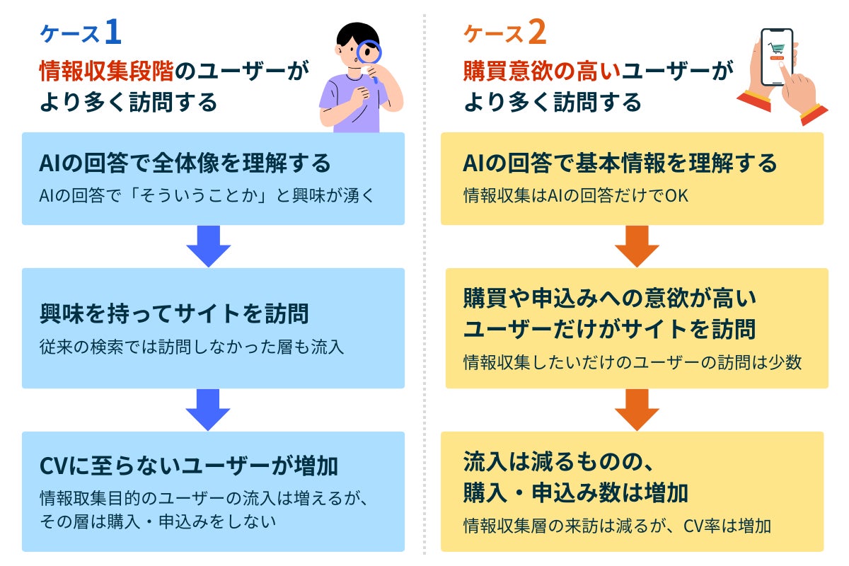 つまり、AIが直接的に情報を提供することで、Webサイトを訪問するユーザーの「温度感」が2つに分かれやすくなっているといえるでしょう。