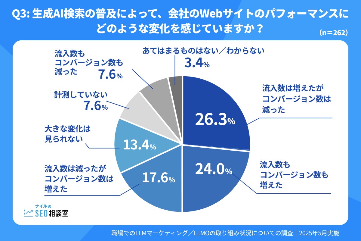 生成AI検索の普及による影響については、「流入数もコンバージョン数も増えた」(24.0%)と回答した企業は一定数ありましたが、「流入数は増えたがコンバージョン数は減った」(26.3%)、「流入数は減ったがコンバージョン数は増えた」(17.6%)といった真逆の傾向が見られている企業もあるようです。