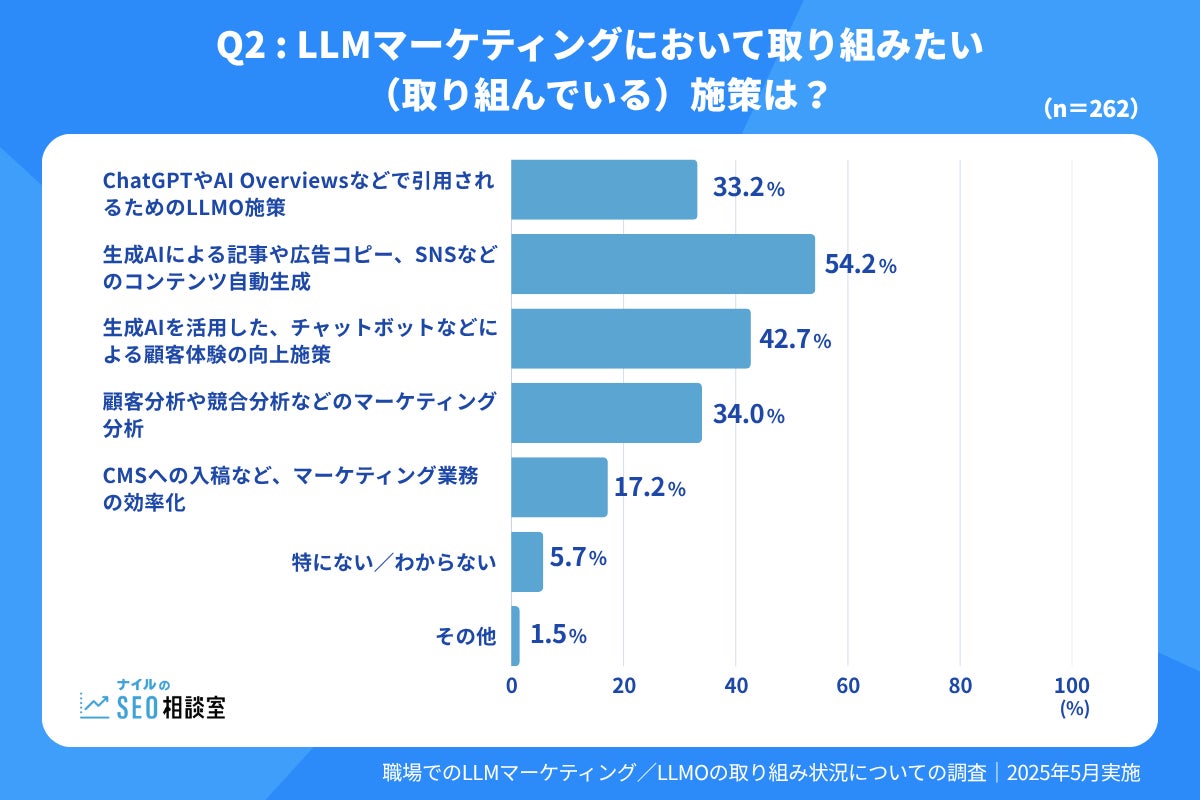 LLMマーケティングにおいて取り組みたい(取り組んでいる)施策としては、「コンテンツの自動生成」(54.2%)や「マーケティング分析」(34.0%)、「マーケティング業務の効率化」(17.2%)といった、業務効率化を目的とした活用の検討をしている企業が多いようです。