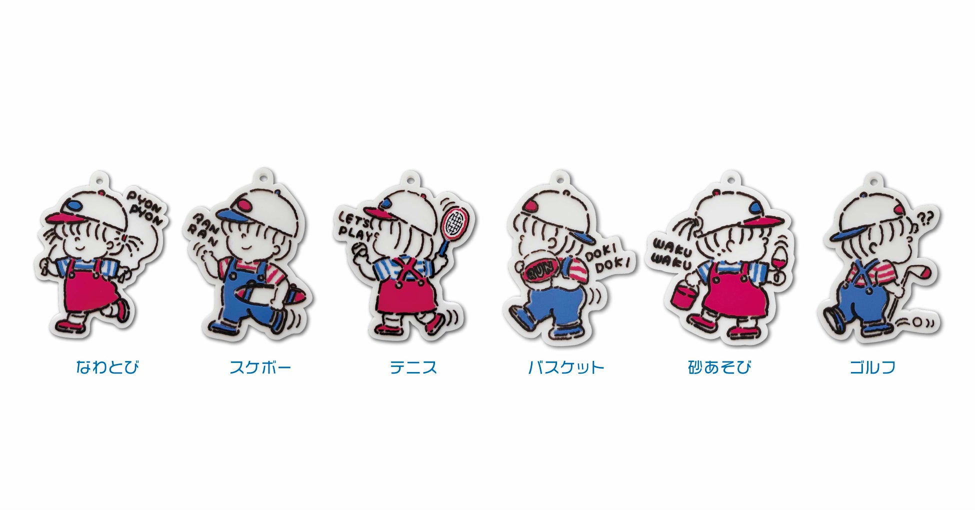 遊んでいる子どもたちが総柄から飛び出し、単体でのラバーマスコットとなっています。
