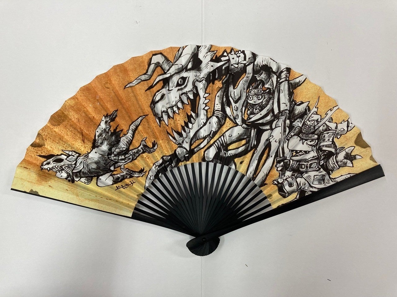 「扇子を作るということで、歌川国芳の「がしゃどくろ」のようなカイジュウにしようと思いました。妖怪ではないカイジュウ達を和風なタッチで百鬼夜行のような行列にしてみました。また金色をあえて錆で表現。カッコよくできたかなと思います。(渡辺)」