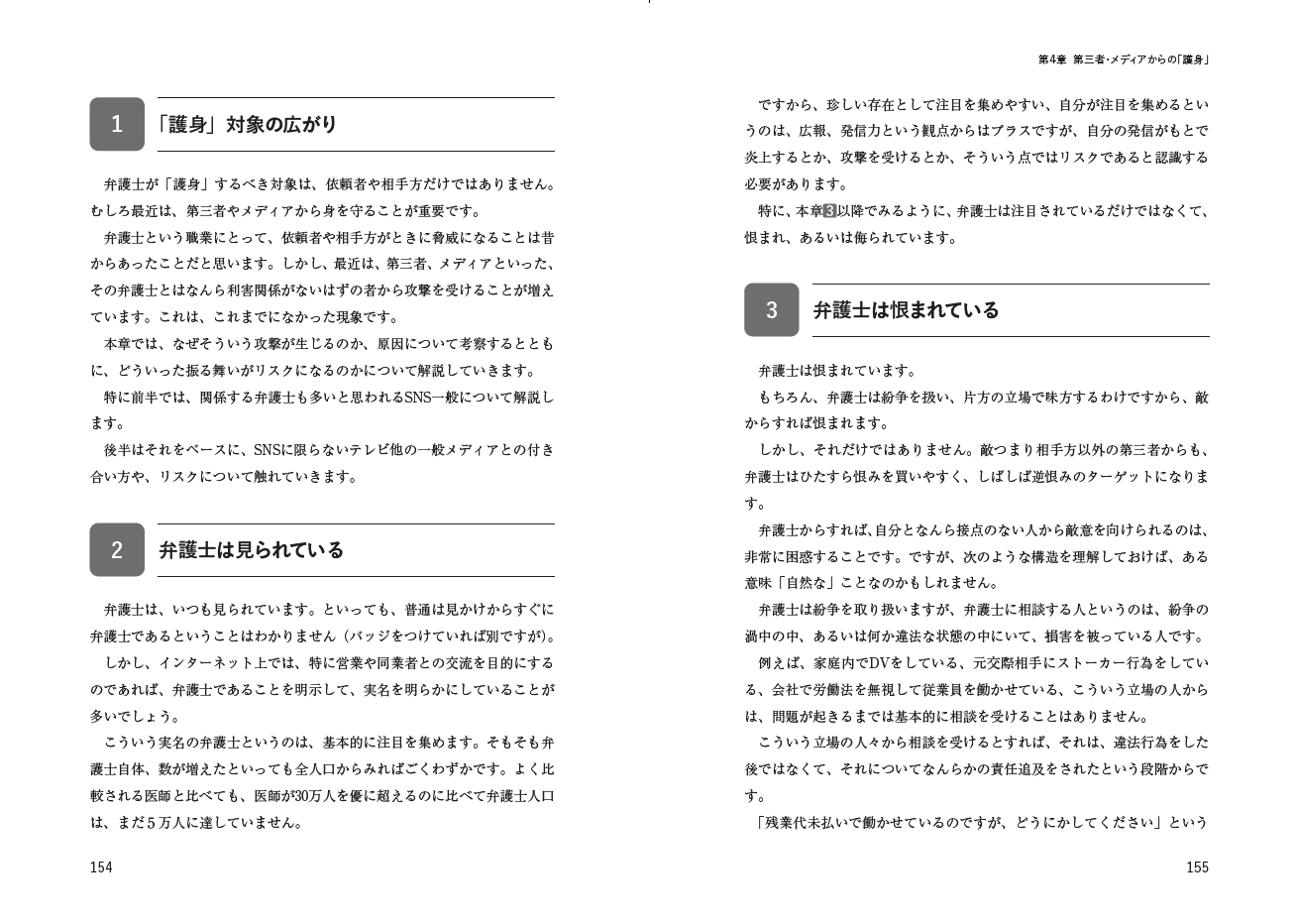対「依頼者」「事件の相手方」「第三者・メディア」に属性を分けて、人的トラブルへの「護身術」と心得を伝授します。
