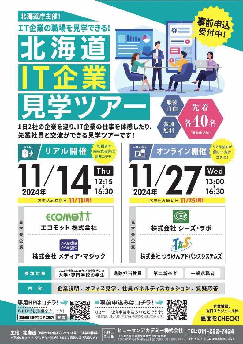 北海道庁では、道内IT産業企業の人材確保を支援するため、大学・専門学校等の学生や一般求職者を対象に、IT企業の業務内容や職場環境への理解を深めていただくことを目的とする職場見学ツアーを下記のとおりリアルとオンラインで開催します。