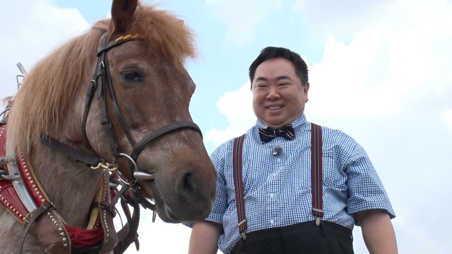 篠崎ポニーランドでポニー馬車に乗りながら、ゆったりゆったり登場した塚地武雅(ドランクドラゴン)。人間の年齢だと推定53歳というポニーの“こむぎちゃん”に御年54歳の塚地が「50代、これからもがんばろう」とエールを送る。