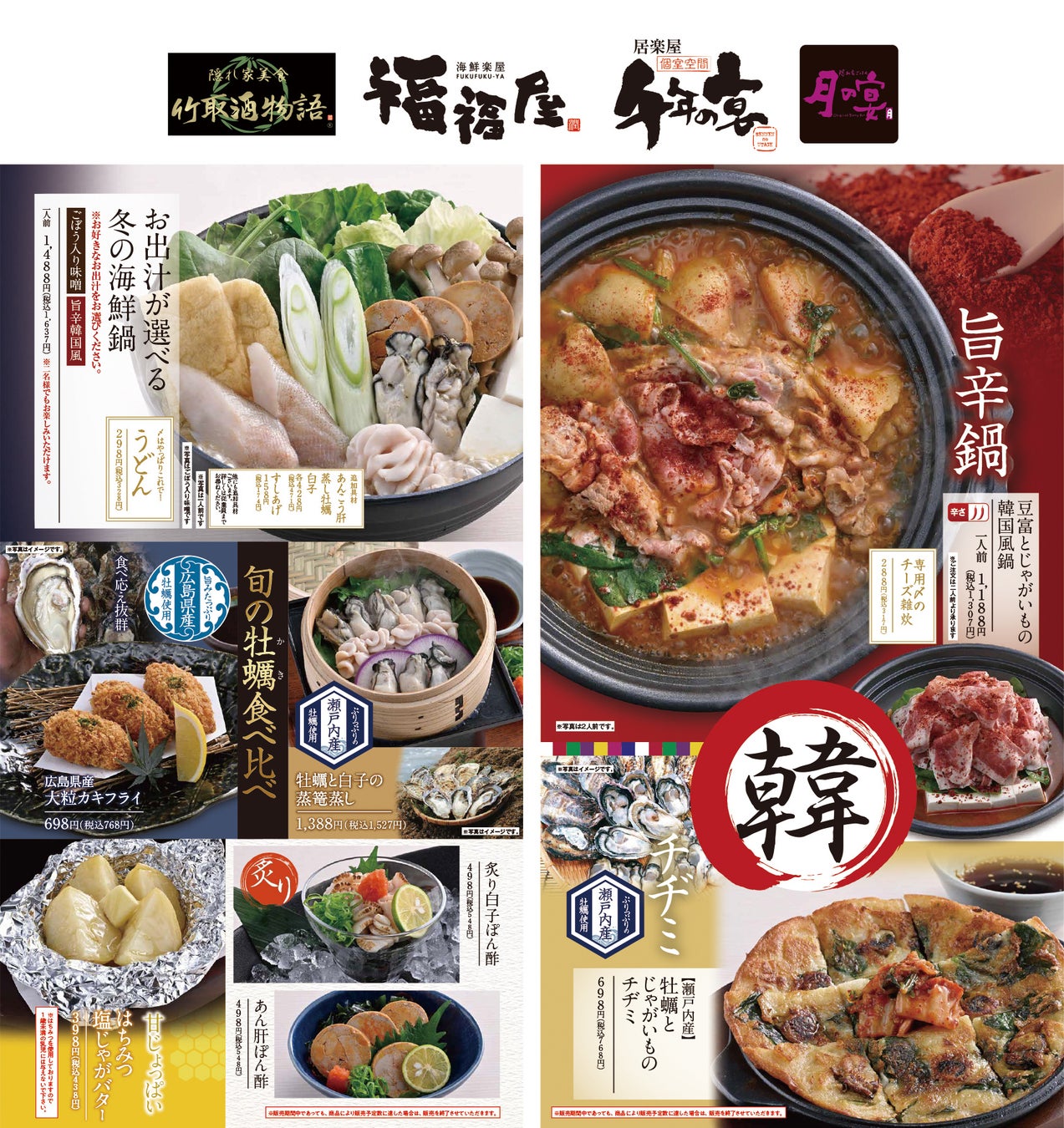 株式会社モンテローザ(本社:東京都杉並区 代表取締役:大神輝博)は、令和6年12月1日(日)から「千年の宴」「福福屋」「月の宴」「竹取酒物語」で季節限定メニューの販売を開始します。『豆富とじゃがいもの韓国風鍋』や『牡蠣とじゃがいものチヂミ』、広島県産の『大粒カキフライ』や、瀬戸内産の“牡蠣”を使用した『牡蠣と白子の蒸籠蒸し』など、冬の味覚を存分に味わえるメニューをご用意しました。