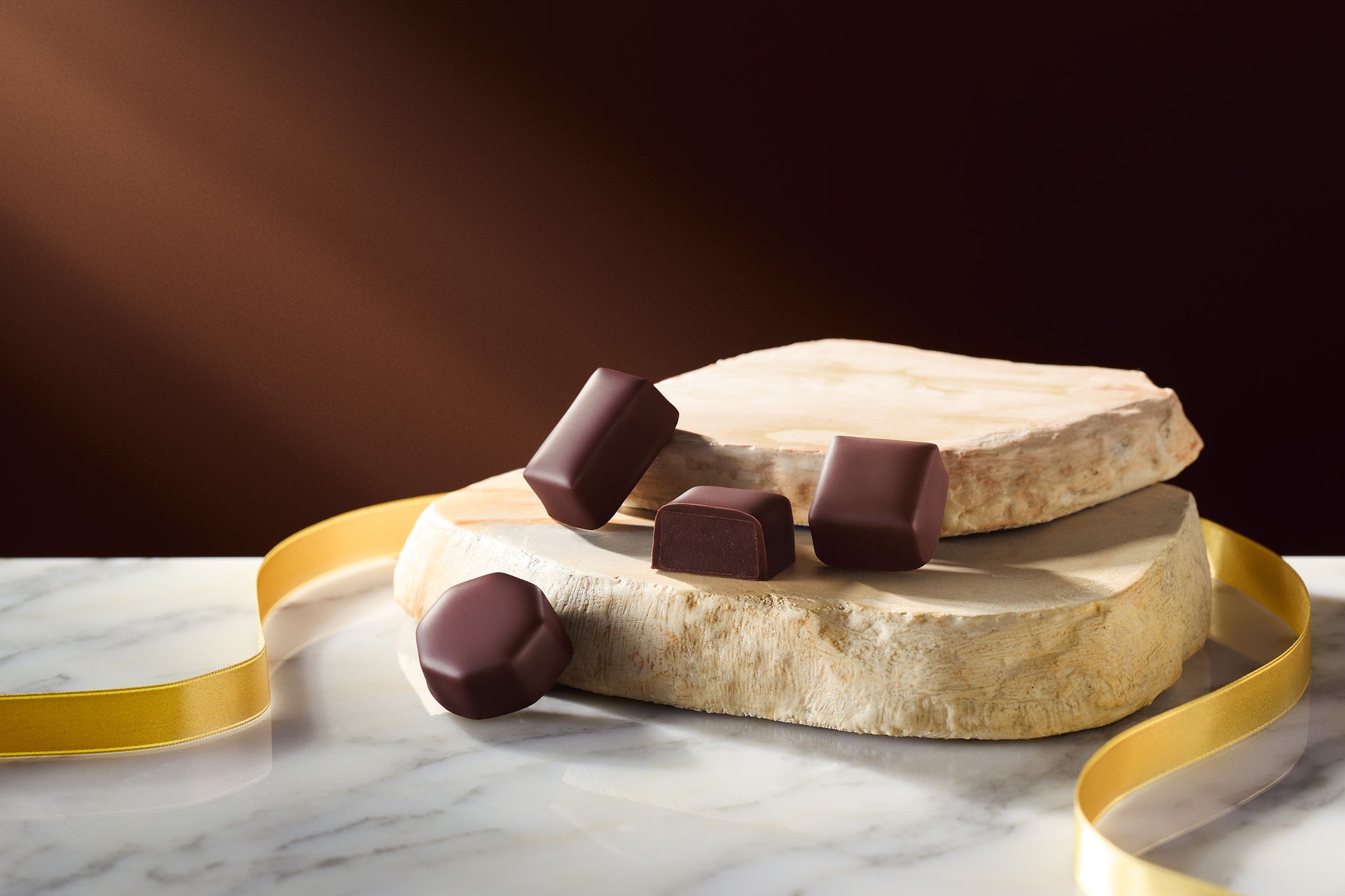 正方形のペルー産は、カカオ分81%チョコレートを使用し、なめらかなくちどけとシナモンのような華やかな風味が、余韻まで続きます。長方形のドミニカ産は、カカオ分82%チョコレートを使用し、甘みと酸味のバランスがとれた、ほのかにフルーティーな味わいが広がります。多角形のガーナ産は、カカオ分83%チョコレートを使用し、重厚なカカオの風味とくちどけが織りなす、王道の味わいが楽しめます。