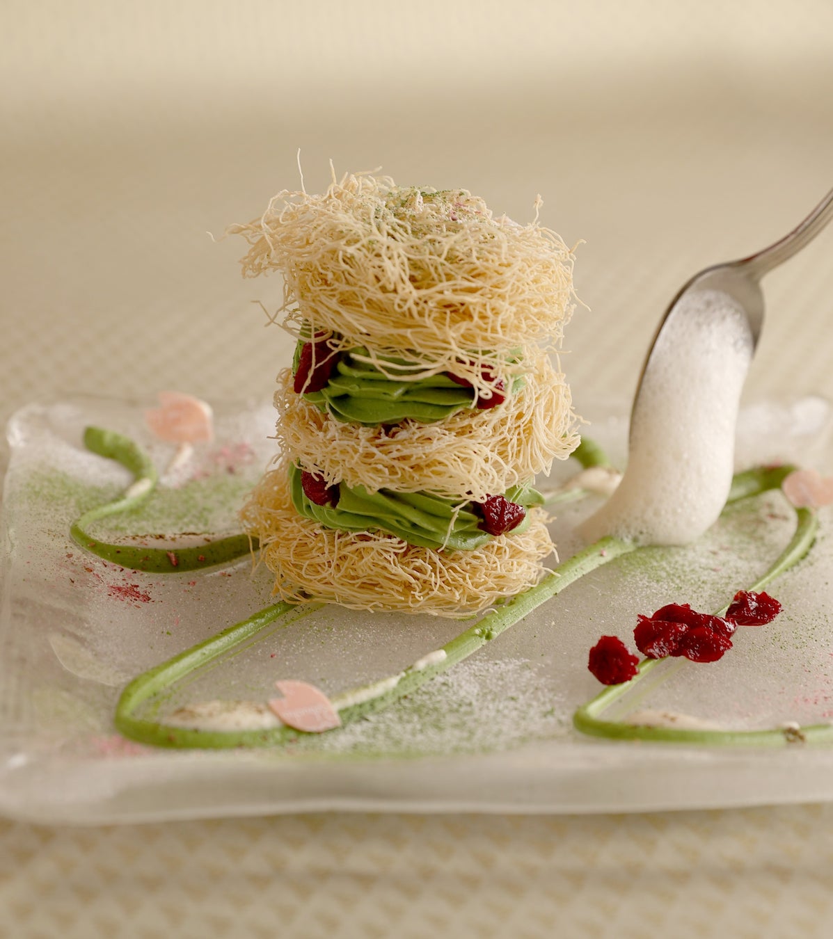 “ジョエル・ロブションが愛した日本一のお茶”「八女茶」の香りと味わいをデザート共に 春限定の新作「八女抹茶のミルフィーユ~天使の髪をつむいで~」