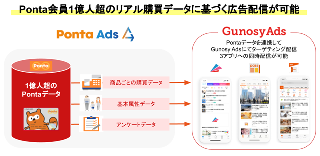 今回の連携により、「Ponta Ads」の接続メディア「Ponta コネクティッドメディア」の中に「Gunosy Ads」が追加され広告配信が可能になることに加え、「Gunosy Ads」での広告配信においても、Ponta会員1億人超のリアル購買データに基づいたターゲティング配信が可能になります。