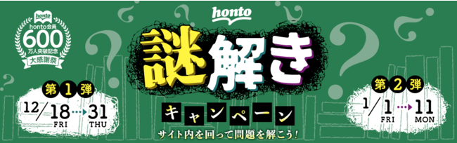 期間中に出題される問題に、hontoサイト内を回遊して答えを導き、正解するとプレゼントがもらえるキャンペーンです。出題は第1弾、第2弾の2回を予定しています。外出自粛が続きそうな今年の年末年始に、巣ごもりエンタメをお楽しみください。