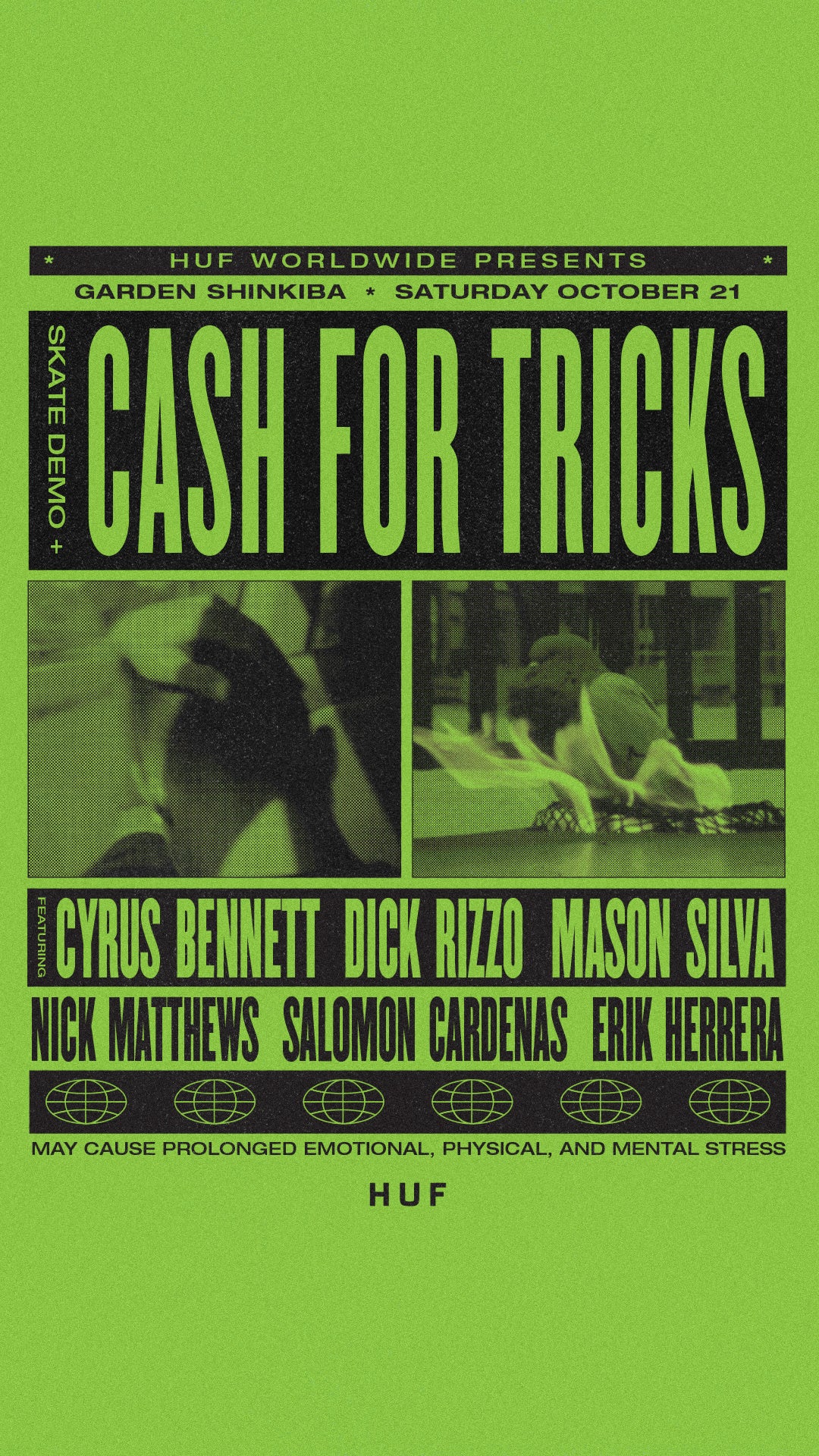 HUF WORLDWIDE PRESENTS "SKATE DEMO + CASH FOR TRICKS”と題した、スケートボードのイベントを10月21日(土)に新木場にて開催いたします。