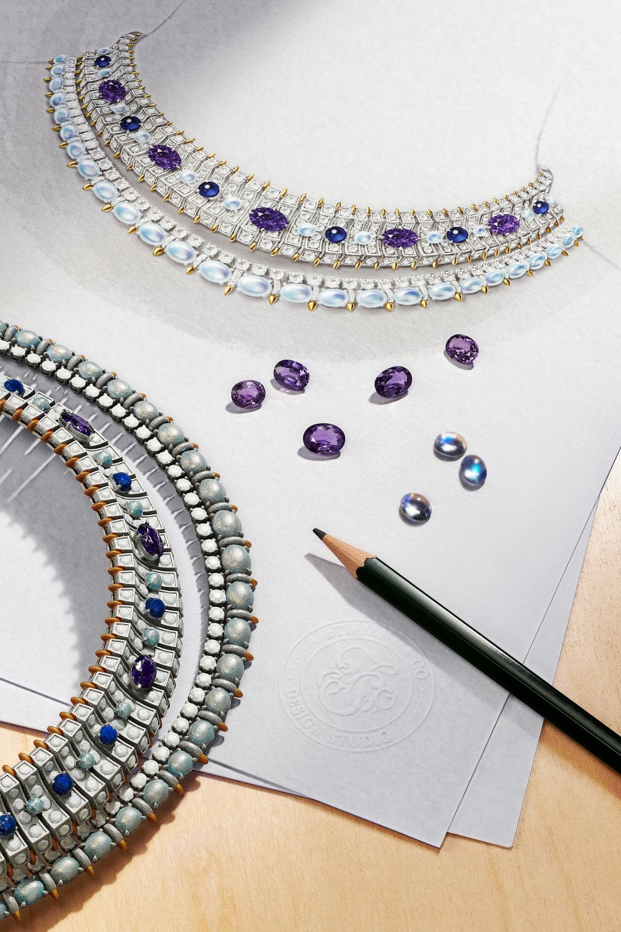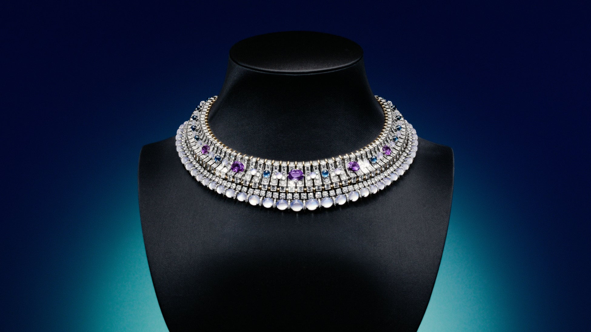 「シーホース」の章では、ザ ティファニー アーカイブに残るアイコニックなモチーフを再解釈しています。1968年にジャン・シュランバージェが発表した傑作であるタツノオトシゴのブローチに着想を得て、ヴェルデイユは、パープル サファイヤ、ムーンストーン、ブルー サファイヤといった思いがけないカラーストーンの組み合わせで、表情豊かな質感と対比を生み出し、神話上の存在に息吹を吹き込みました。約1,600時間をかけて丁寧に作られたネックレスは、合計11カラットを超えるアンエンハンスメントの貴重なパープル サファイヤに、ダイヤモンド、ムーンストーン、ブルー サファイヤがあしらわれています。このトランスフォーム可能なデザインは、ムーンストーンの連を取り外すことができるため、3つのスタイルで着用できます。