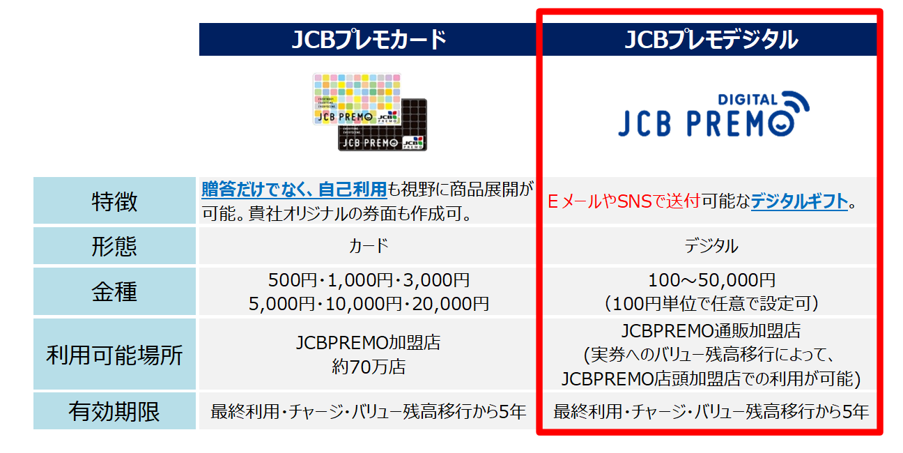 JCBプレモデジタルは、メールやSNSで簡単に贈ることができるデジタルギフトで、JCB PREMO加盟店のオンラインショッピング・ウェブサイトでご利用いただけます。また、JCBプレモカードへのバリュー移行により、コンビニエンスストアや百貨店など全国70万店以上のJCB PREMO加盟店でもご利用いただけます。