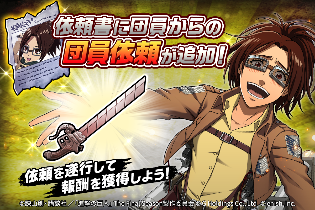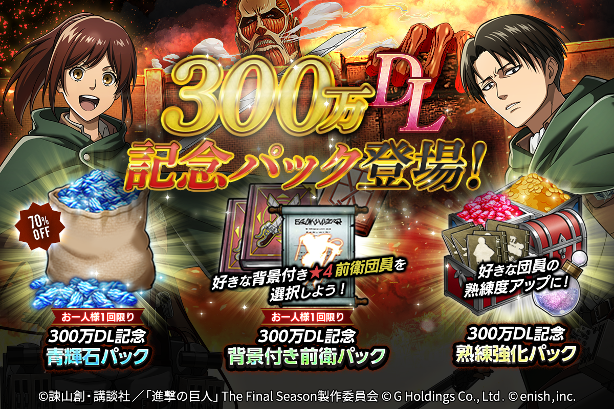 株式会社enish(本社:東京都港区、代表取締役社長:安徳 孝平、以下enish)は、アニメ『進撃の巨人』のスマートフォンゲーム最新作「進撃の巨人Brave Order」にて、累計ダウンロード数が300万を突破いたしました。また、熟練度+12以降に必要となる熟練技能書の数が緩和される記念キャンペーンを実施いたします。その他300万DLを記念してお得なパックも続々登場!最新情報は、ゲーム公式サイト・ゲーム公式Twitterアカウントにて随時公開して行きますので、ぜひご覧ください。