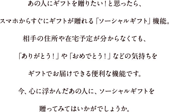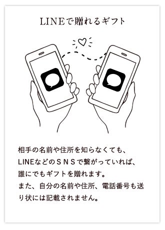 ソーシャルギフトとは、名前や住所を知らない相手にも、LINEやSNS、メールなどで気軽にギフトを贈れるサービスです。