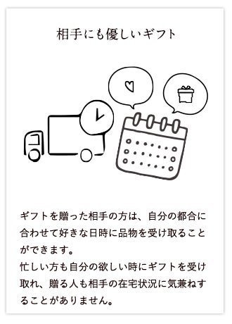 受取専用URLにデジタルメッセージカードを添えて送信します。ギフトを受け取った方は、住所やお届け日などを入力して、お好きな日時にギフトを受け取ることができます。