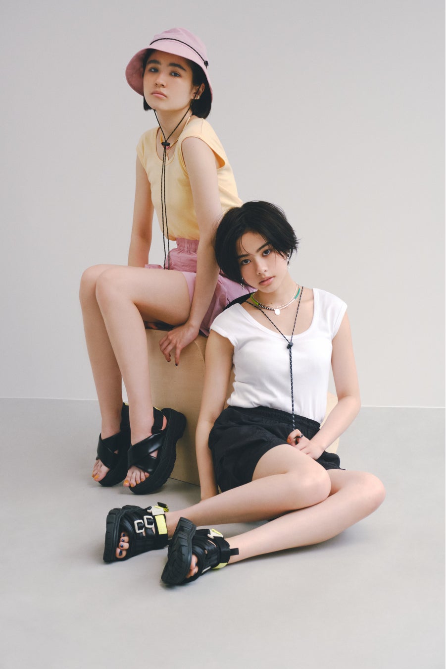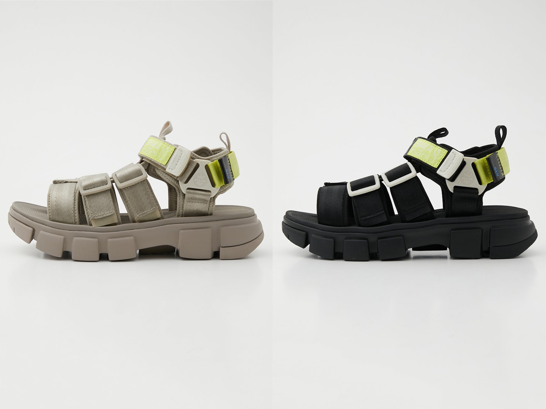 SHAKAの人気モデルでもあるテープがシートベルトタイプの「NEO RALLY SF」は、バックルのカラーをSLYオリジナルの配色にアレンジし、ボリュームのあるチャンキーソールの「FIESTA PUFF CHUNKY」は、アッパーにフェイクレザーを使用し中綿を入れることで歩きやすさと女性らしさを兼ね備えた一足にアップデートした全2型がラインナップ。