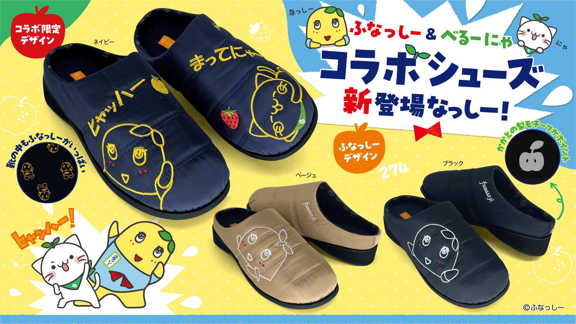 ■特長:人気のサボシューズにふなっしーデザインを落とし込んだアイテム。様々な箇所にふなっしーのイラストやモチーフがちりばめられたデザインと、ふなっしーとベルーナ公式キャラクター「べるーにゃ」が共演するデザインの3柄を展開します。