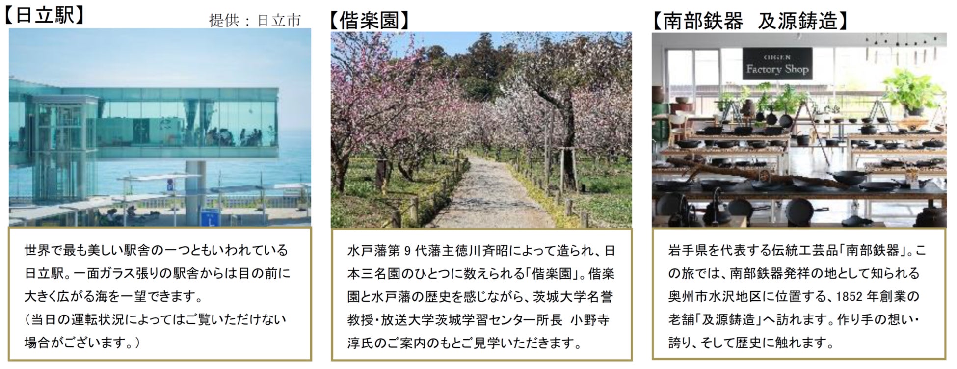 その時々の東日本エリアに息づく、その季節ならではの旬を楽しむコースです。「早春の梅林を歩き、奥州伝統の鉄器を知る。悠久の時を超えて、先人の足跡をたどる旅」をテーマに、早春の茨城・岩手・宮城を「四季島」で巡ります。