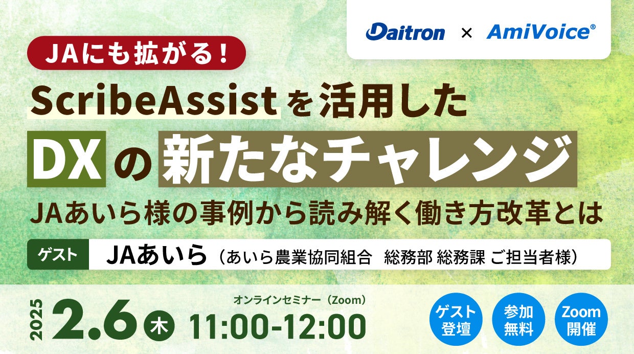 2025年2月6日(木)、株式会社アドバンスト・メディア(本社:東京都豊島区、代表取締役会長兼社長:鈴木清幸 以下、アドバンスト・メディア)は、オンラインセミナー「JAにも拡がる!『ScribeAssist』を活用したDXの新たなチャレンジ~JAあいら様の事例から読み解く働き方改革とは~」を共催いたします。