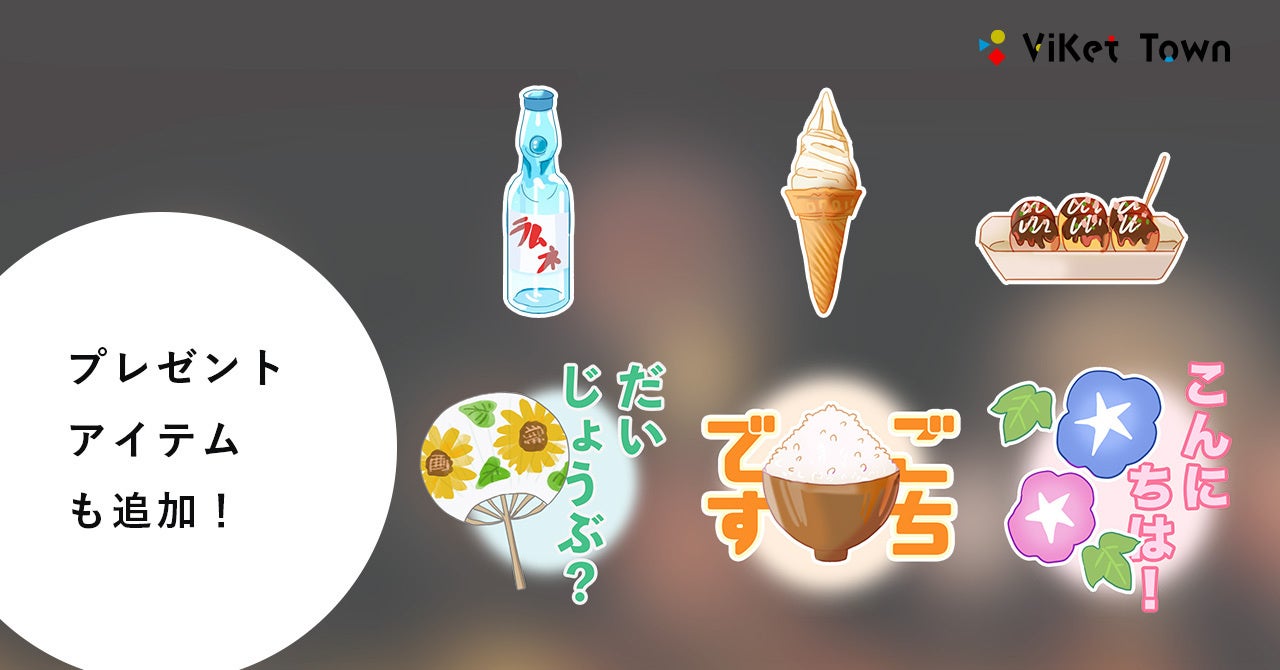 ViKet Townではプレゼントやメッセージ付きアイテムも毎月更新中。コミュニケーションを促すスタンプや、引き続き夏にぴったりな冷たい食べ物やアイテムがリリース!