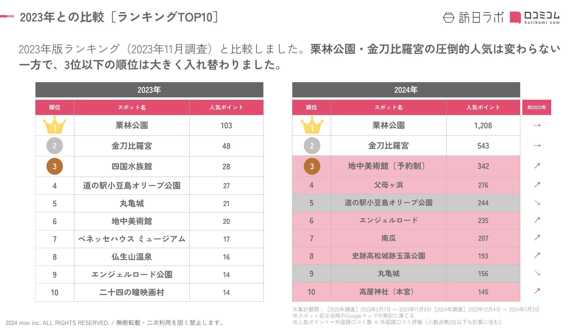 栗林公園・金刀比羅宮の圧倒的人気は変わらない一方、3位以下は大きく順位が入れ替わりました。