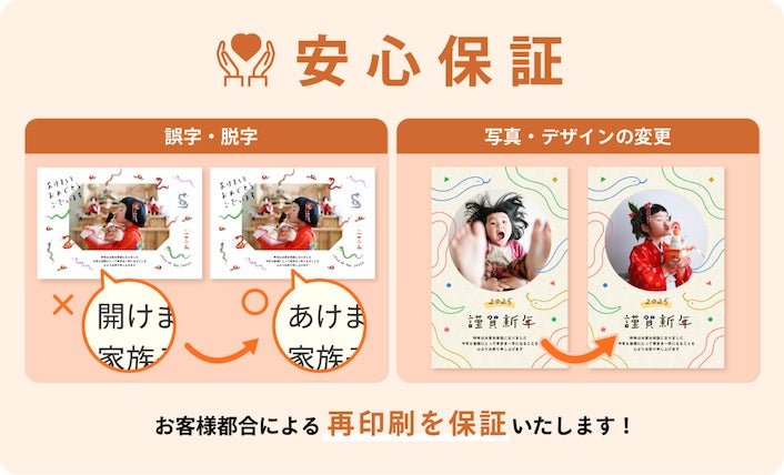 誤字や脱字の修正、デザイン変更など、お客様のご都合による再印刷を保証します。