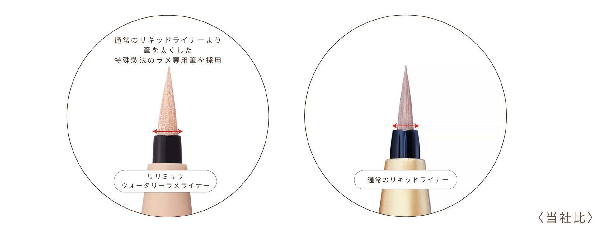 ウォータリーラメライナーは通常のリキッドアイライナーより筆を太くした特殊製法のため、ラメとパールを多く配合することができました。太いラインも細いラインもムラなく均一にラメがのるので、一筆で簡単に輝きと立体感のある涙袋メイクを作れます。肌なじみがよく透け感のあるナチュラルな発色なので涙袋だけでなく、ポイントハイライトとしてもお使いいただけます。