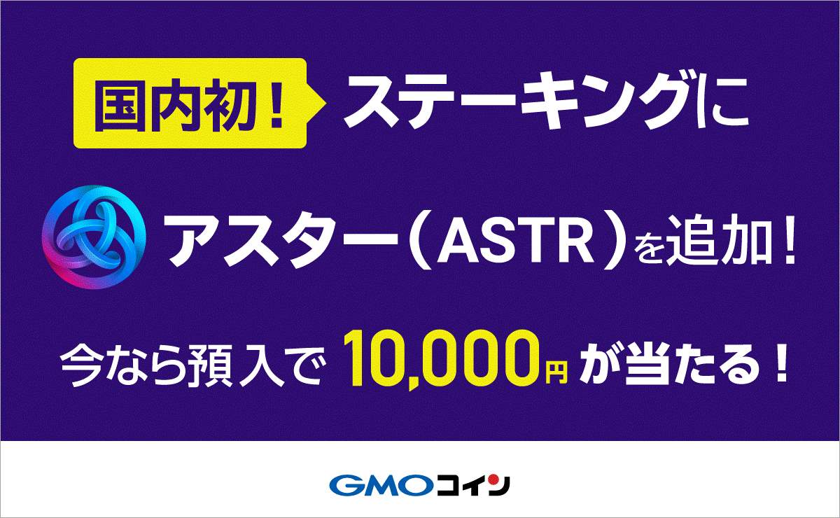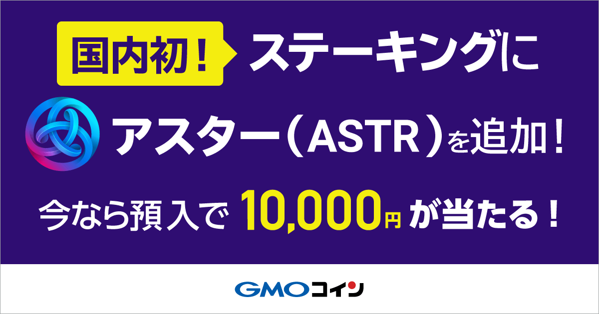 また、国内初となるアスター(ASTR)の「ステーキング」追加を記念して、期間中にGMOコインにおいて「500 ASTR以上」お預入いただいたお客さまを対象に、抽選で100名様に現金1万円をプレゼントするキャンペーンを開催いたします。