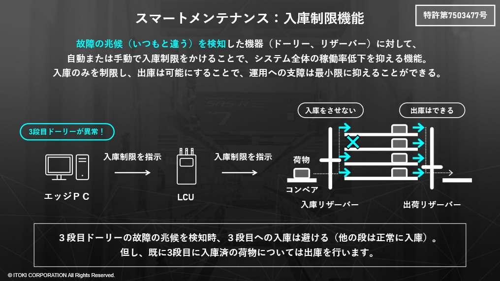 「ITOKIアドバンスドメンテナンス」は、シャトル式自動倉庫「システマストリーマー SAS-R」の稼働データを収集・AI解析し、故障の兆候を事前に把握することで、突発的な設備停止のリスクを軽減し、業務計画の安定化と、物流の「止まらない運用」を実現します。