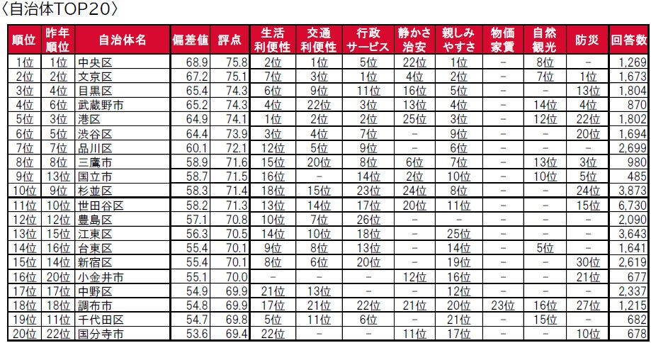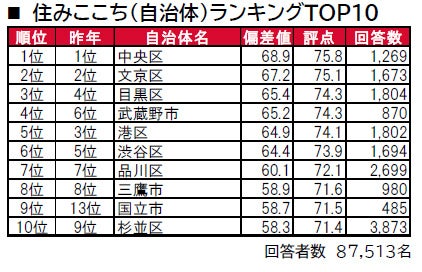 1位は、4年連続で中央区、2位も4年連続で文京区という結果になっています。3位は、昨年4位の目黒区、また、昨年13位だった国立市がトップ10入りしています。なお、昨年調査でトップ10入りした自治体のうち、9自治体が今回もトップ10に入る結果となっています。