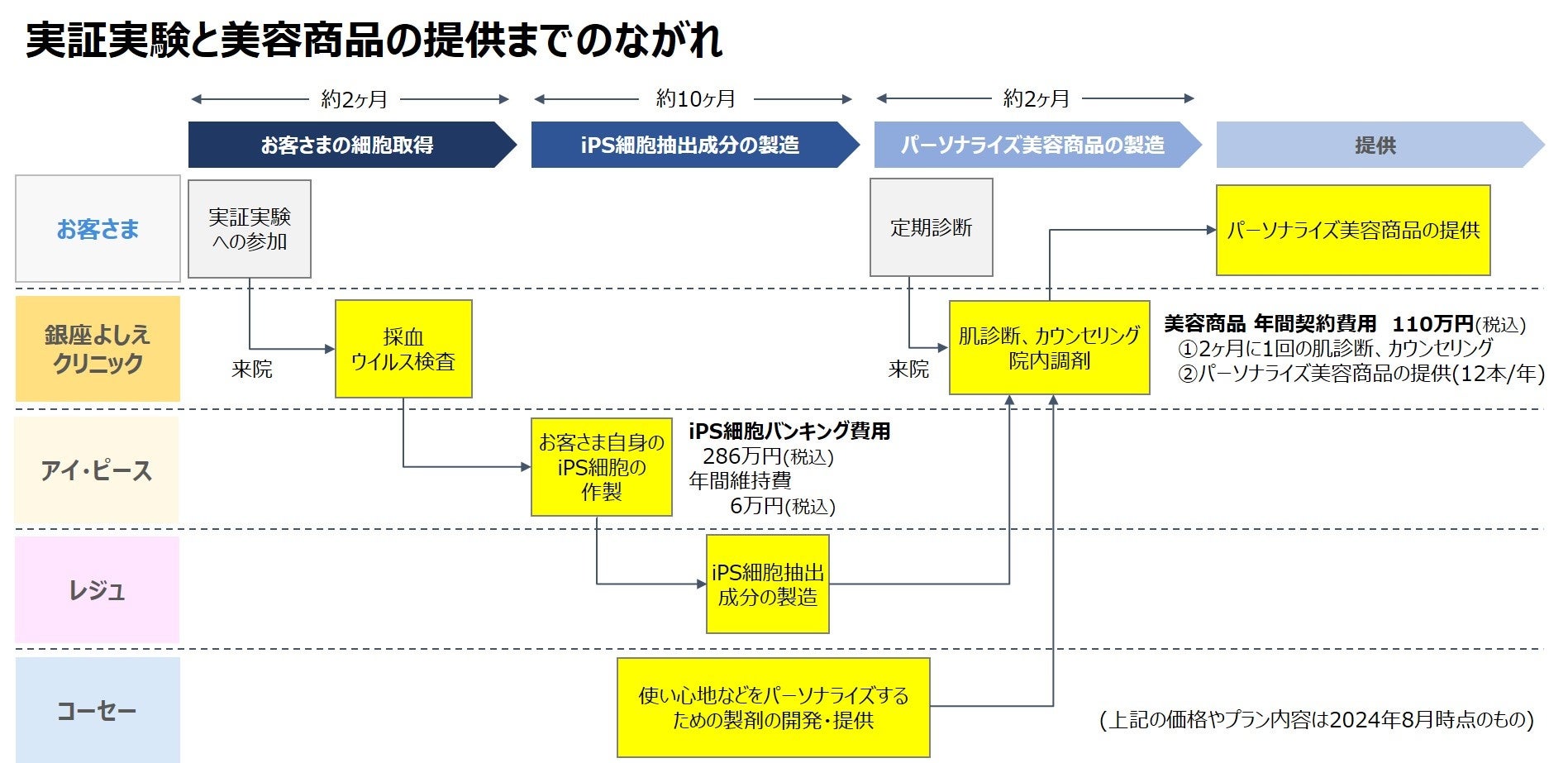 株式会社コーセー(本社:東京都中央区、代表取締役社長:小林 一俊)、アイ・ピース株式会社(I Peace, Inc.、本社:米国パロ・アルト、創設者・CEO:田邊 剛士)、レジュ株式会社(Reju, Inc.、本社:東京都港区、CEO:神谷 友里江)は、お客さま自身のiPS細胞(※1)からの抽出成分「iPSF」を配合したパーソナライズ美容商品(※2)の提供に向けた実証実験を、医療法人社団優恵会(本社:東京都、総院長:廣瀬 嘉恵)の運営する「銀座よしえクリニック」を通じて2024年8月から年間30人の顧客を対象に開始します。