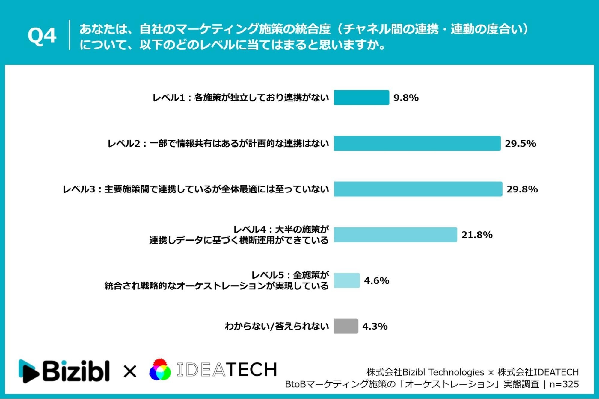 「Q4. あなたは、自社のマーケティング施策の統合度(チャネル間の連携・連動の度合い)について、以下のどのレベルに当てはまると思いますか。」(n=325)と質問したところ、「レベル1:各施策が独立しており連携がない」が9.8%、「レベル2:一部で情報共有はあるが計画的な連携はない」が29.5%という回答となりました。