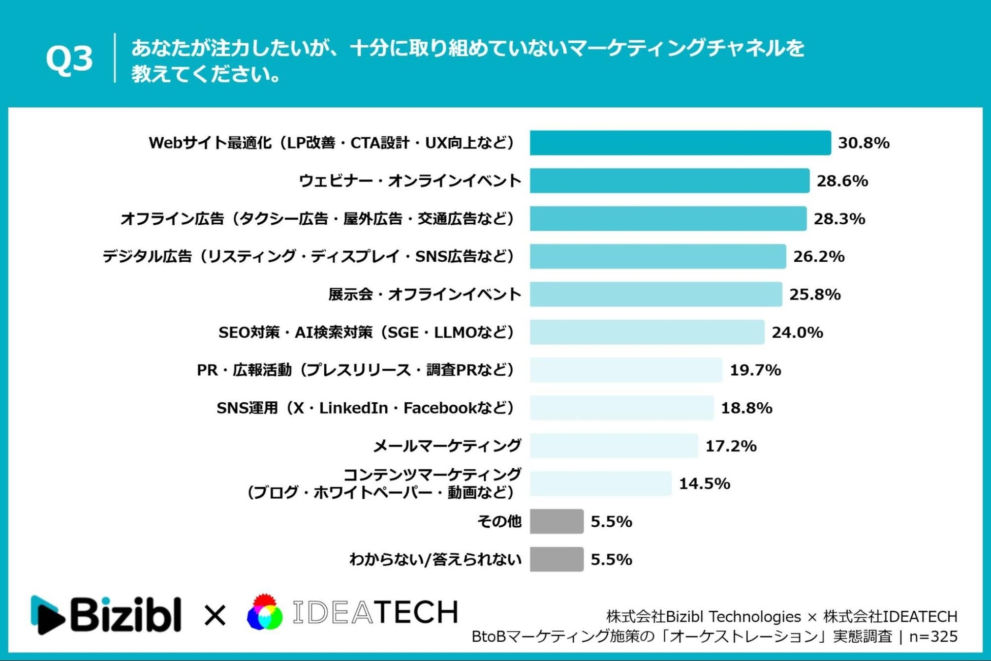 「Q3. あなたが注力したいが、十分に取り組めていないマーケティングチャネルを教えてください。」(n=325)と質問したところ、「Webサイト最適化(LP改善・CTA設計・UX向上など)」が30.8%、「ウェビナー・オンラインイベント」が28.6%、「オフライン広告(タクシー広告・屋外広告・交通広告など)」が28.3%という回答となりました。